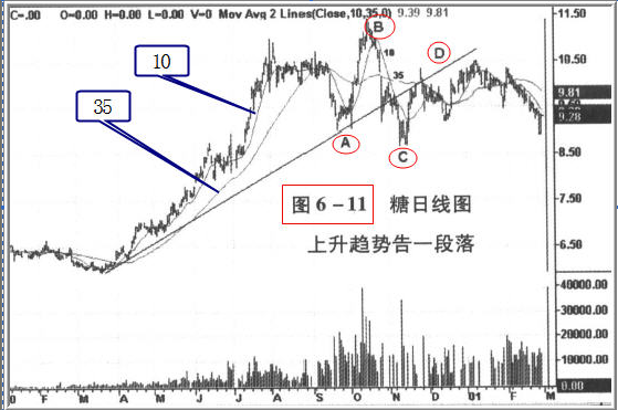 如何判断趋势是否已经结束? 交易者必须知道既有趋势是否即将结束或已经结束,否则仓位恐怕无法及时出场。除了一些明显的迹象之外(例如:突破趋势线),更可以通过走势图分析趋势状况。对于既有的上升(下降)来说,只要价格继续停留在前一波低点之上(高点之下),上升(下降)趋势就还没有遭到破坏。请参考下图的糖日线图,一直到C 点跌破前一波低点(A 点)为止,上升趋势才遭到破坏。当价格由C 点向上弹升时,到了D 点就折返,显然没有穿越前一波高点(B 点)而创新高,这可以确认上升趋势已经结束。